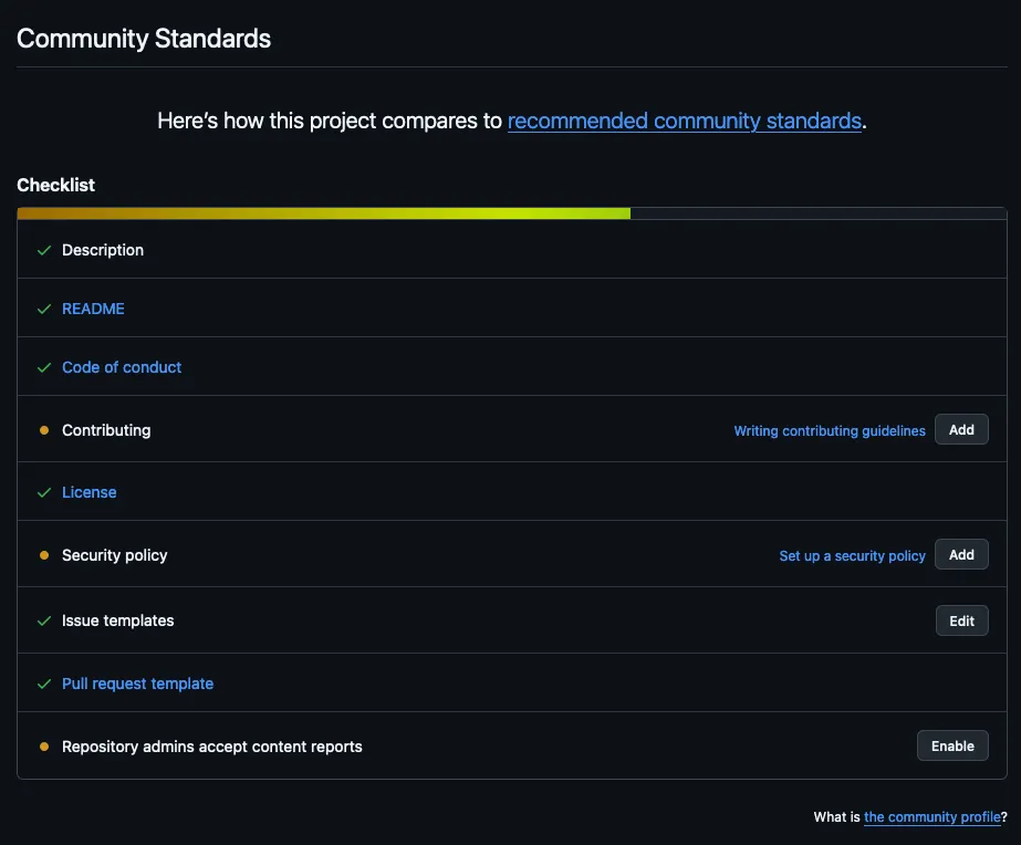 The Community Standards section evaluates your repository’s adherence to some Open Source best practices. It lists essential files such as:
